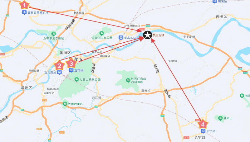 ③宜宾五粮液机场公交站(西客站方向)至正气巷下车,同站换乘39路(世纪名苑方向)至李庄游客中心下车,步行至酒店。用时约2小时。